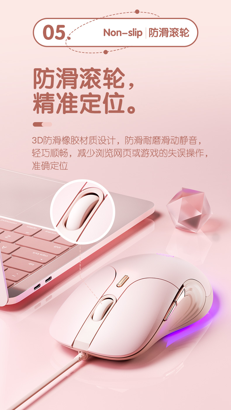 为女生手型设计,鼠标两侧采用特殊纹路防滑格栅,